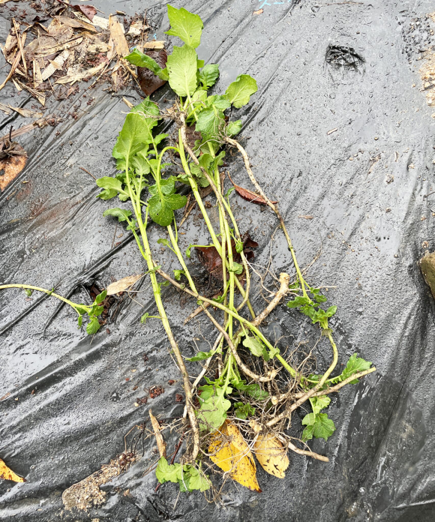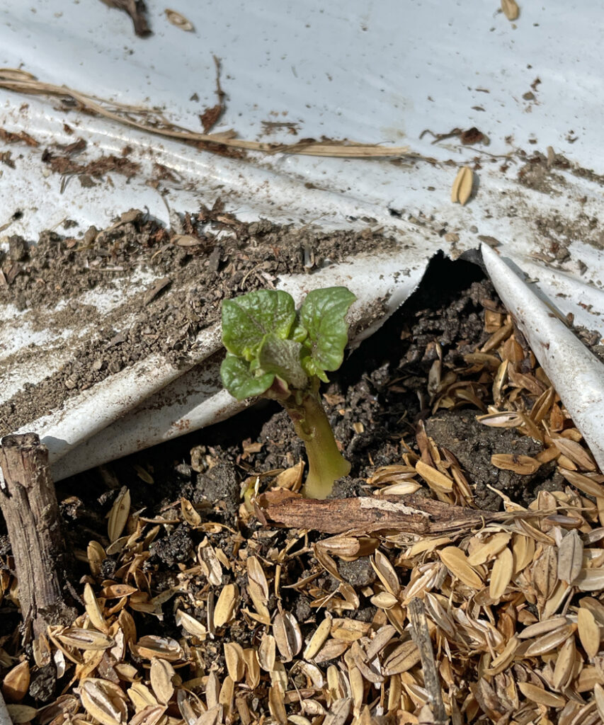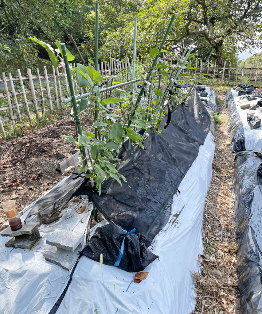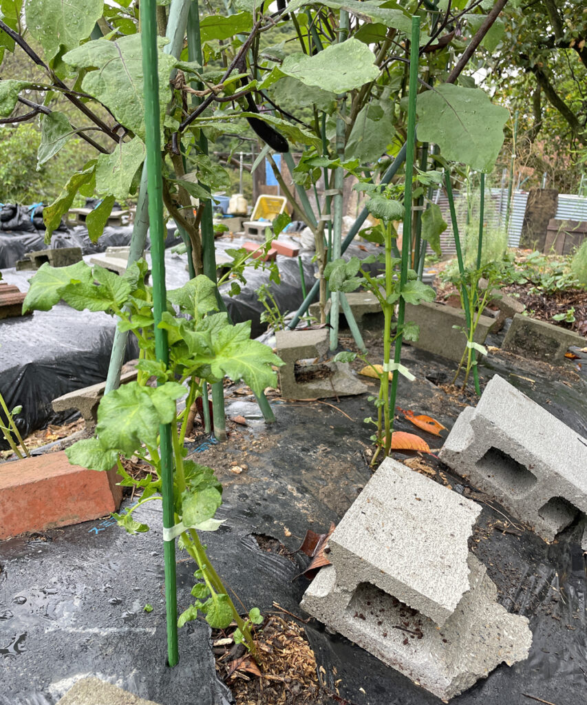 定植場所は、ナスビの畝の間に植えました。理由は、白いマルチを使っている事、ナスの日陰になる事、遮光ネットを使っている事で・・畝の温度が上がり難いからです。