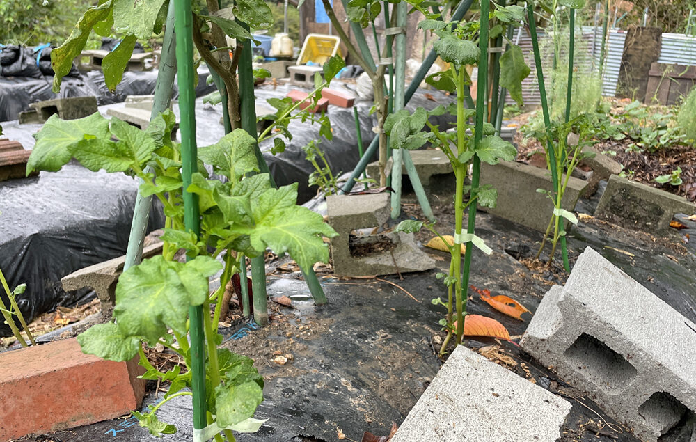 「2本仕立て」にしました。ひょろひょろの姿なので支柱を立てて支えました。
