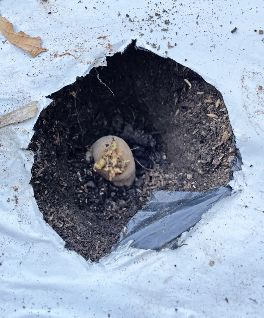 以上の準備をして10月8日に「秋じゃが」の種芋を植えました。種イモは芽を上にして植えます。腐れ易いので種芋は切らずに丸のままです。