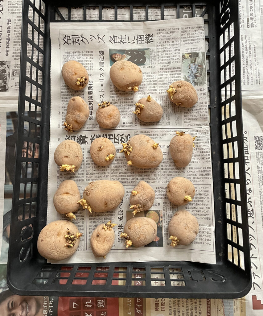 「秋じゃが」は・・暑い時に種芋を植えると腐る、遅いと大きく育たない。植えるタイミングが難しかったが、短い期間でもすぐに芽が出るように、「種芋の芽出し」を事前にして置きました。8月20頃購入して、冷房効いた部屋のソファーの下に置いて(20日間)・・「芽出し」をしました。