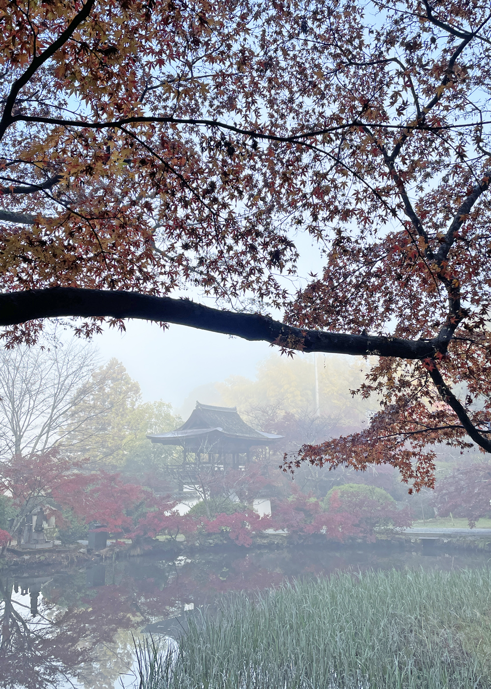 霧と紅葉と長岳寺・・良い雰囲気でした。(スマホ撮影)
