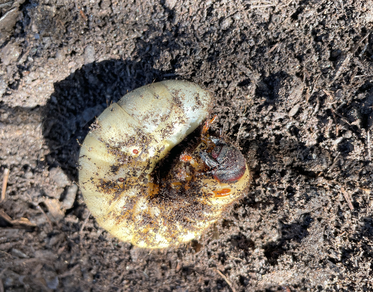 カブトムシのメスは、1匹で卵を20個くらい生むそうです。そしてすぐに孵化して幼虫で冬を越して、来年の7月頃に成虫に成長します。どうやら畑の近くのカブト虫は、私の畑の通路に卵を産んだようです。可愛そうなので、出て来た幼虫を木チップの中に移しました。しかし、通路の有機物の入れ替えは10%くらいしかしていません、一体、この畑にはカブト虫の幼虫が何匹いるのでしょうか? おそらく300匹 ・・いやー、400匹くらいはいるのでは・・笑