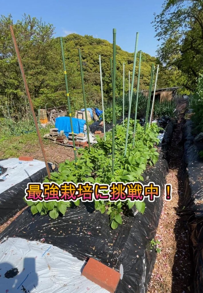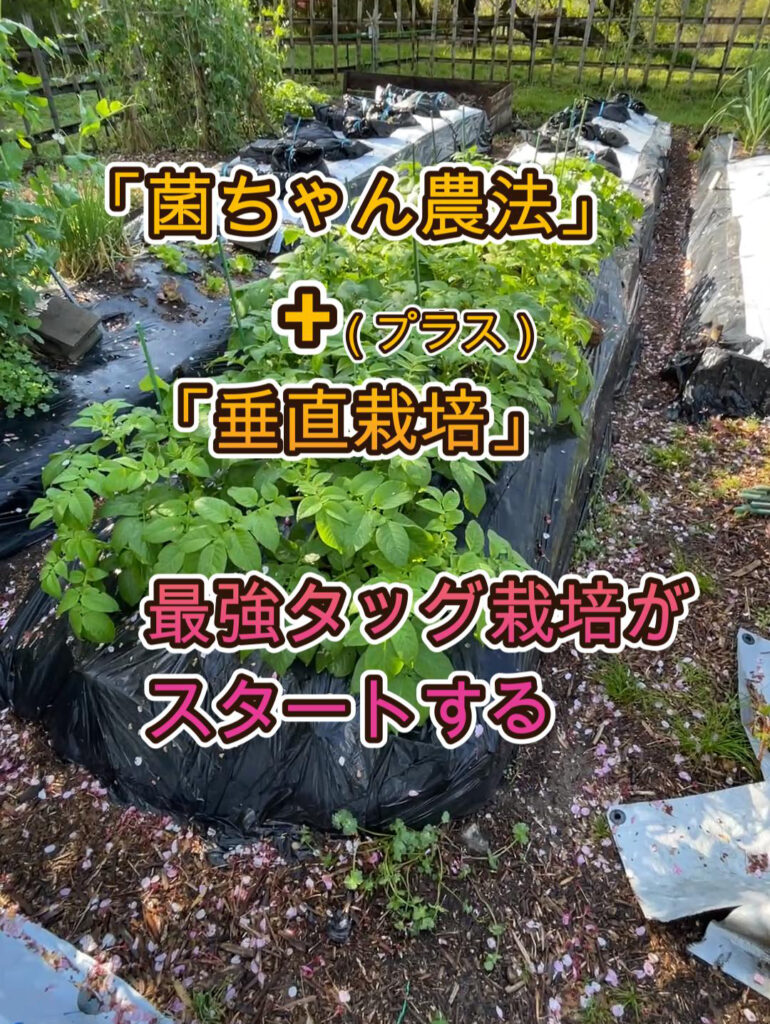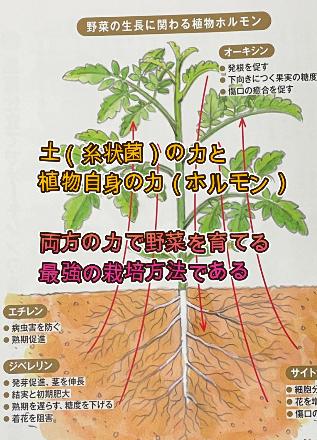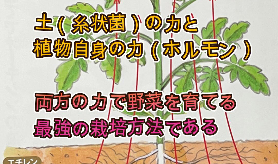 土の中の「土壌菌(糸状菌・菌糸ネットワーク)の力」で育てる「菌ちゃん農法」と、「植物ホルモンの力」で野菜を育てる「垂直仕立て栽培」の最強ダブル栽培です。(笑)
