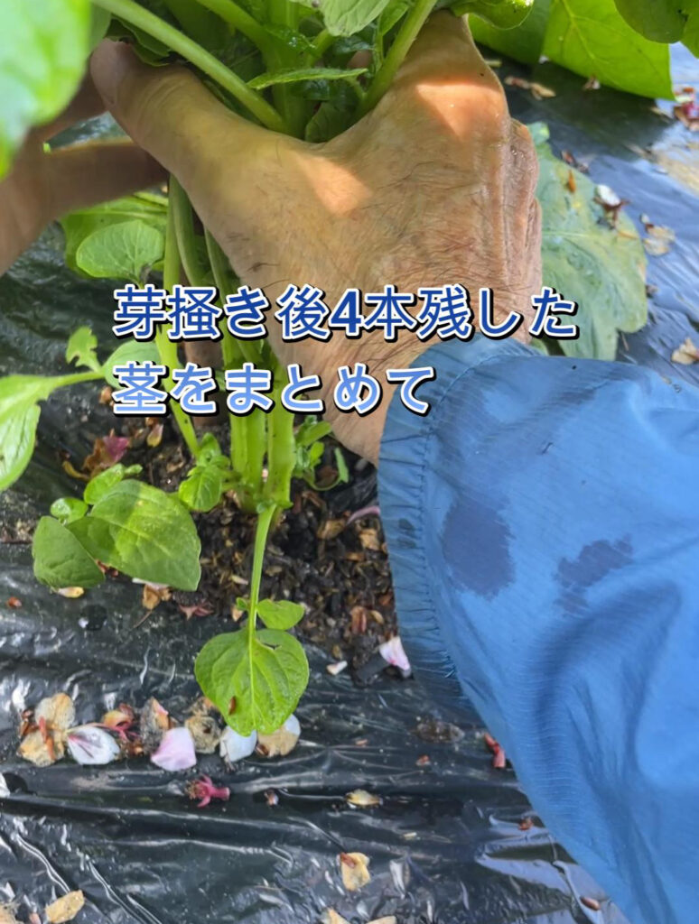 3 芽掻き後、茎を4本残し、束ねて、麻ひもで縛ります。