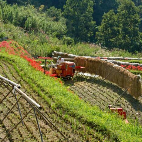 構図の勉強をしています。「稲刈り」「稲架かけ」の写真をモデル…