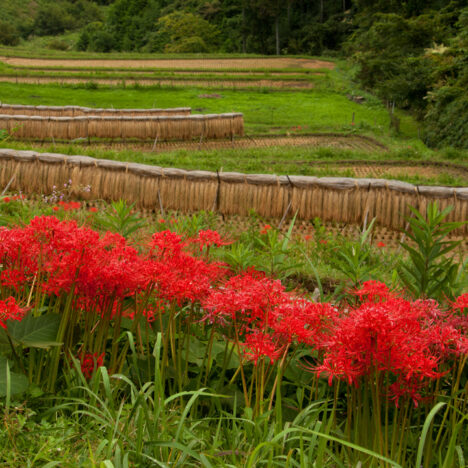 大和は稲刈りが山から里へと進んでいます。柿が色づき、彼岸花が…