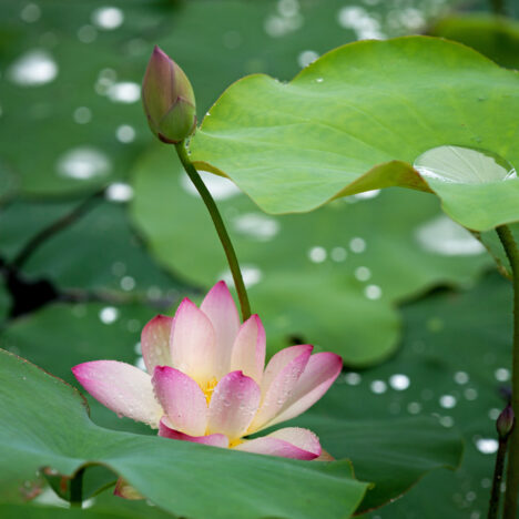 前日に降った雨・・ 蓮の花や大きな葉に水玉がころころ載ってい…