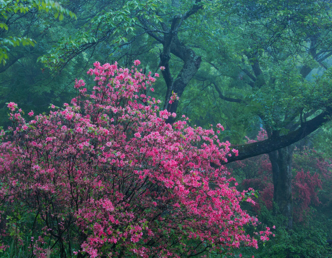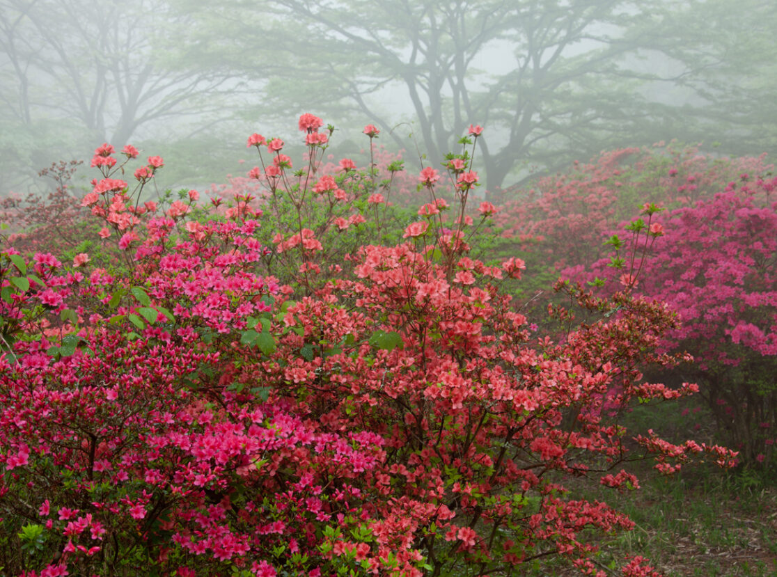ヤマツツジの花も紅葉も・・雨上がりの霧が湧くと幻想的な風景に出会える。また12月に雪が降ると、残った紅葉との共演が楽しめる。