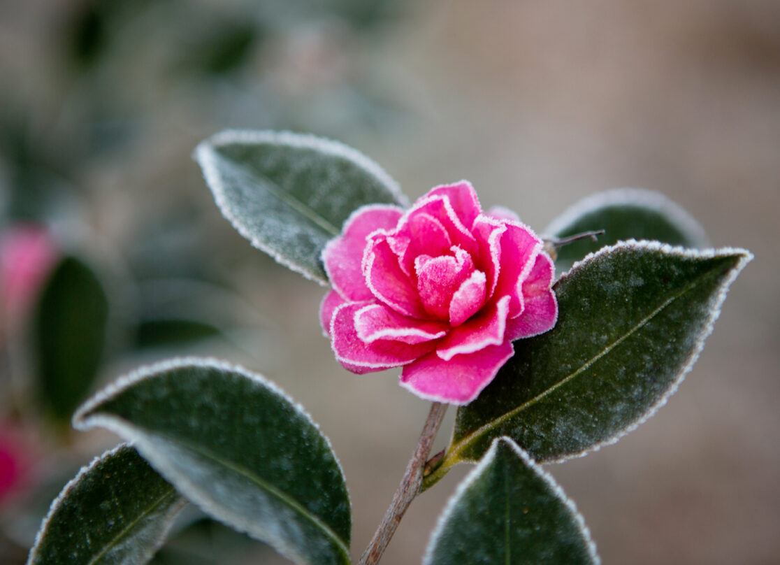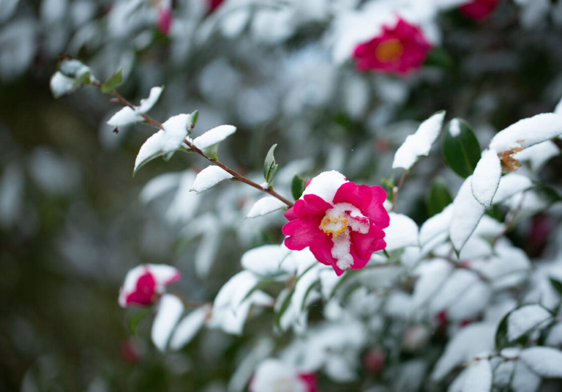 霜が降りた朝・・山茶花の赤い花びらに霜が白く縁取り・・美しい花を見ることが出来ます。また、雪の日は・・白い里山に・・鮮やかな紅い色の山茶花は・・被写体としてカメラマンの写欲を掻き立ててくれます。
