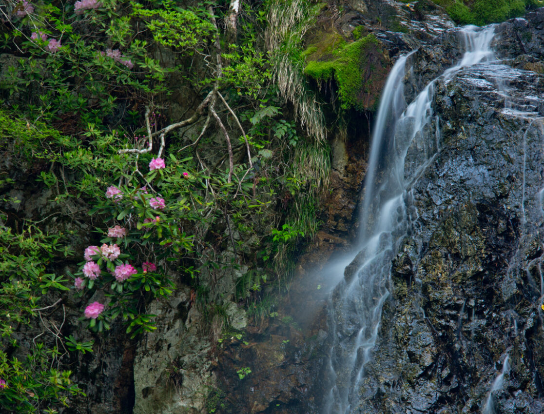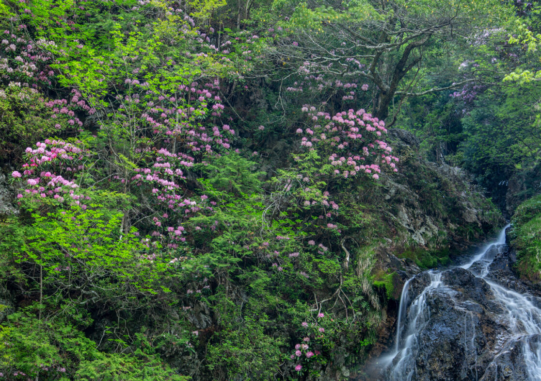 春になると、滝の周辺は、新緑と石楠花の花に包まれる。この季節には多くのカメラマンが滝を訪れ、花と滝の美しい組み合わせを楽しんでいる。