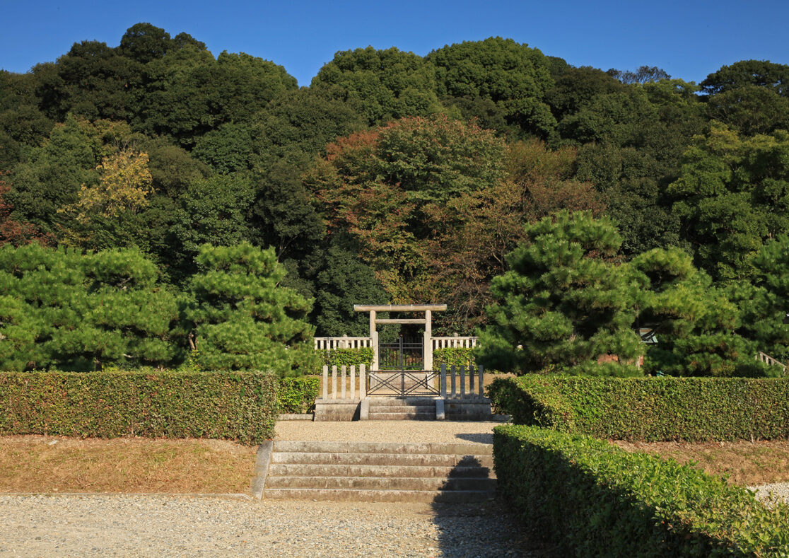 御陵の東側には山の辺の道が通り、のどかな里山と田園風景が広がっている。東方向の小高い場所(ヨガタ塚古墳)からは、景行天皇稜を前景に、大和平野、二上山が展望できる撮影場所がある。