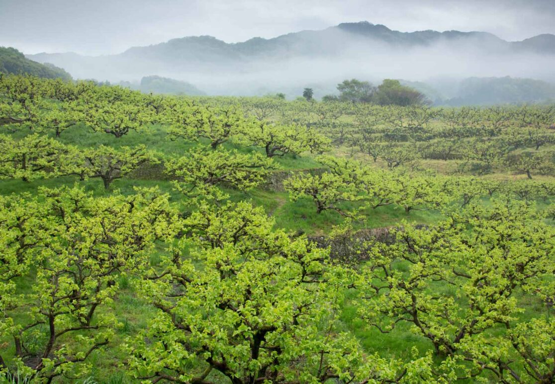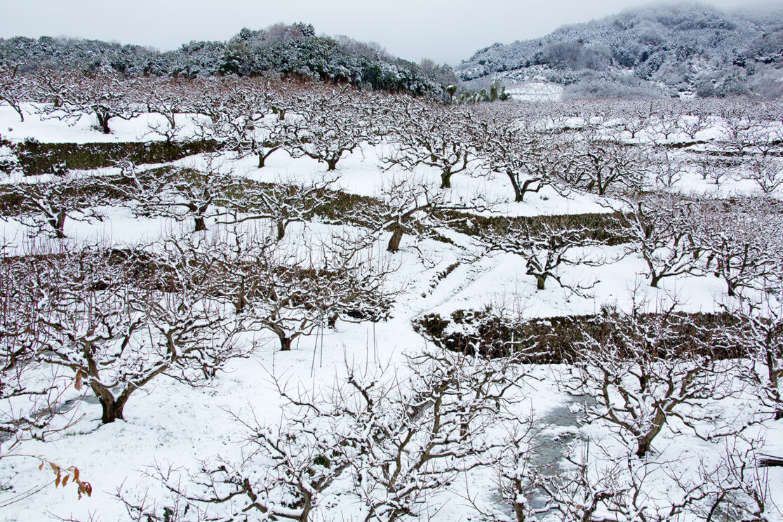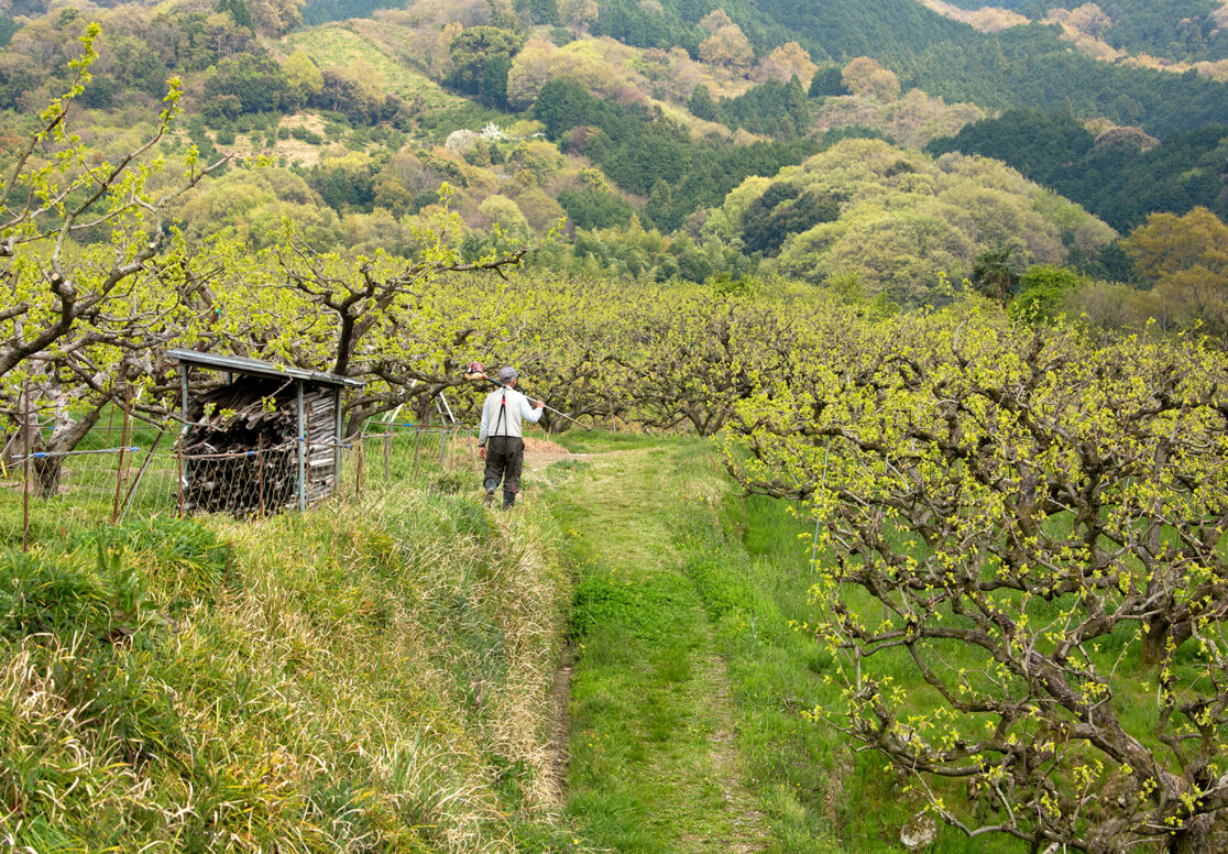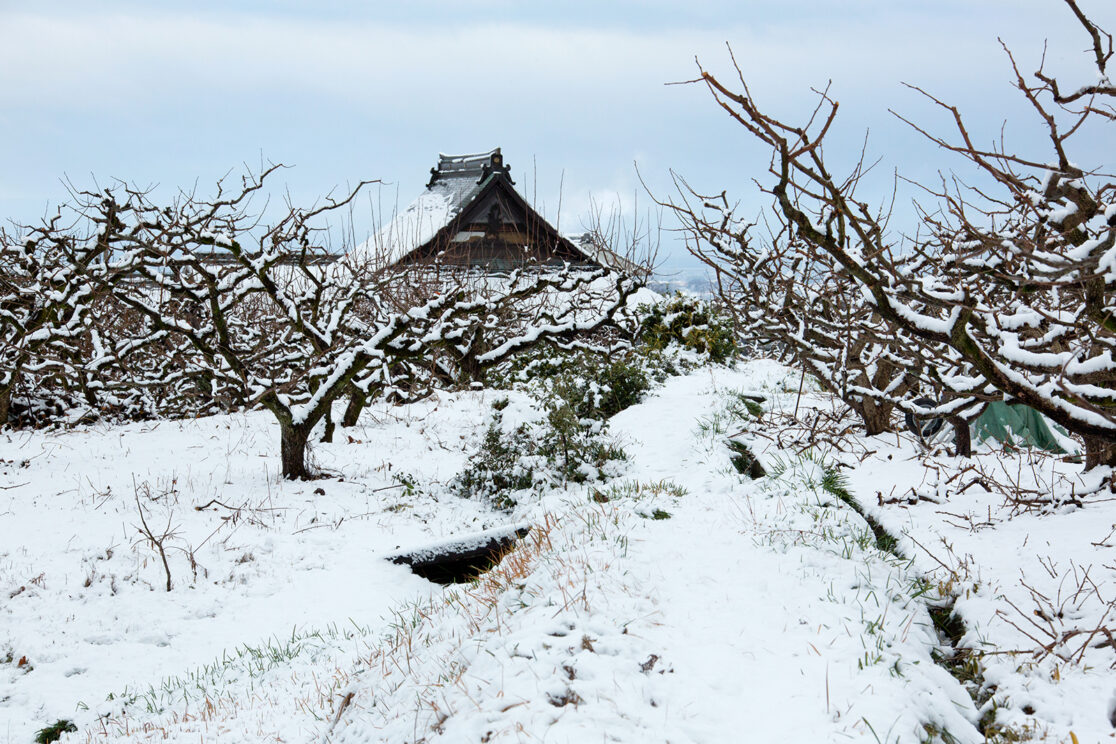 竹乃内環濠集落から800m南へ行くと萱生の集落へ出る。萱生から中山にかけて柿畑が広がる。萱生は刀根早生(合わせ柿)の発祥の地で、昭和55年に刀根淑民さんによって発見され全国に広まった。